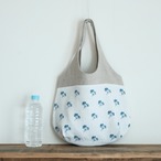 藍の型染めでリネン生地に花柄を染め、丸いトートバッグをつくりました。