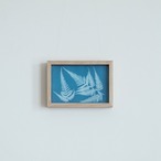 ネガを作らず直接植物を印画紙にのせ露光することで日光に当たった部分は青く発色し、植物の影だけが白く残ります。